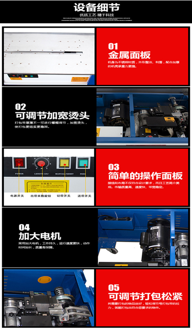 ◆打包機的用途 打包機是以聚乙烯塑料帶為捆扎材料,主要用于商業、郵政、鐵路、銀行、食品、醫藥、書刊發行等行業的紙箱、紙包件、柳編箱、布包件的包裝捆扎。 ◆打包機的工作原理 在插入包裝帶后,機器能自動完成聚帶、熱合、切斷、并出帶的捆扎過程;且有自動停機之功能;打包機是使用打包帶纏繞產品或包裝件,然后收緊并將兩端通過熱效應熔融或使用包扣等材料連接的機器,其工作速度快、效率高、省時省力、捆扎質量高。保證包件在運輸、貯存中不因捆扎不牢而散落,同時還應捆扎整齊美觀。 ◆打包機的特點 1、分離式上下滑板(相對一體式,故障率下降60%) 2、分離式出收帶輪(出帶輪組與收帶輪組是分開,直觀明了,相對一體式,故障率下降60%) 3、切刀更科學:V型切口,效果更好,壽命更長 4、外調松緊裝置,人手調整時松緊力時避免與機芯發生接觸而發生工傷事件 ◆打包機的工作流程 帶子送到位→收到捆扎信號→制動器放開,主電機啟動→右頂刀上升,頂住右帶于滑板處→“T”型導板后退→接近開關感應到退帶探頭→主電機停轉,制動器吸合→打包機退帶電機轉動,退帶0.35秒→帶子收緊捆在物體上→主電機二次啟動,制動器吸合→大擺桿二次拉帶,收緊帶子→左頂體上升,壓緊下層帶子→加熱片伸進兩帶子中間→中頂刀上升,切斷帶子→中頂刀下降→中頂刀再次上升,使兩帶子牢固粘合→中頂刀下降,左右頂刀同時下降→加熱片復位→滑板后退→“T”型導板復位→接近開關感應到送帶探頭→送帶電機啟動,帶動帶子送帶→大擺桿復位→帶子到位,帶頭頂到“T”型導板上接近開關感應到雙探頭→主電機停轉,剎車吸合→打包機完成一個工作循環。 ◆打包機的參數